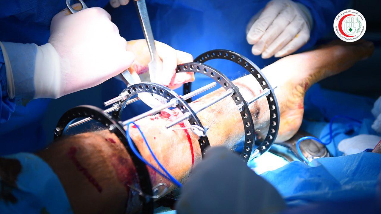 وقال إختصاصي جراحة العظام والكسور والمفاصل بالمستشفى، الدكتور محمد سعد الحارس، في حديث صحافي، إن فريقنا الطبي نجح بعملية تثبيت كسر مركب ومتهشم في أعلى عظم القصبة بالساق الأيسر لمريض يبلغ من العمر (35) عاما، مبيناً إن العملية تمت بإستخدام تقنية الأليزاروف.