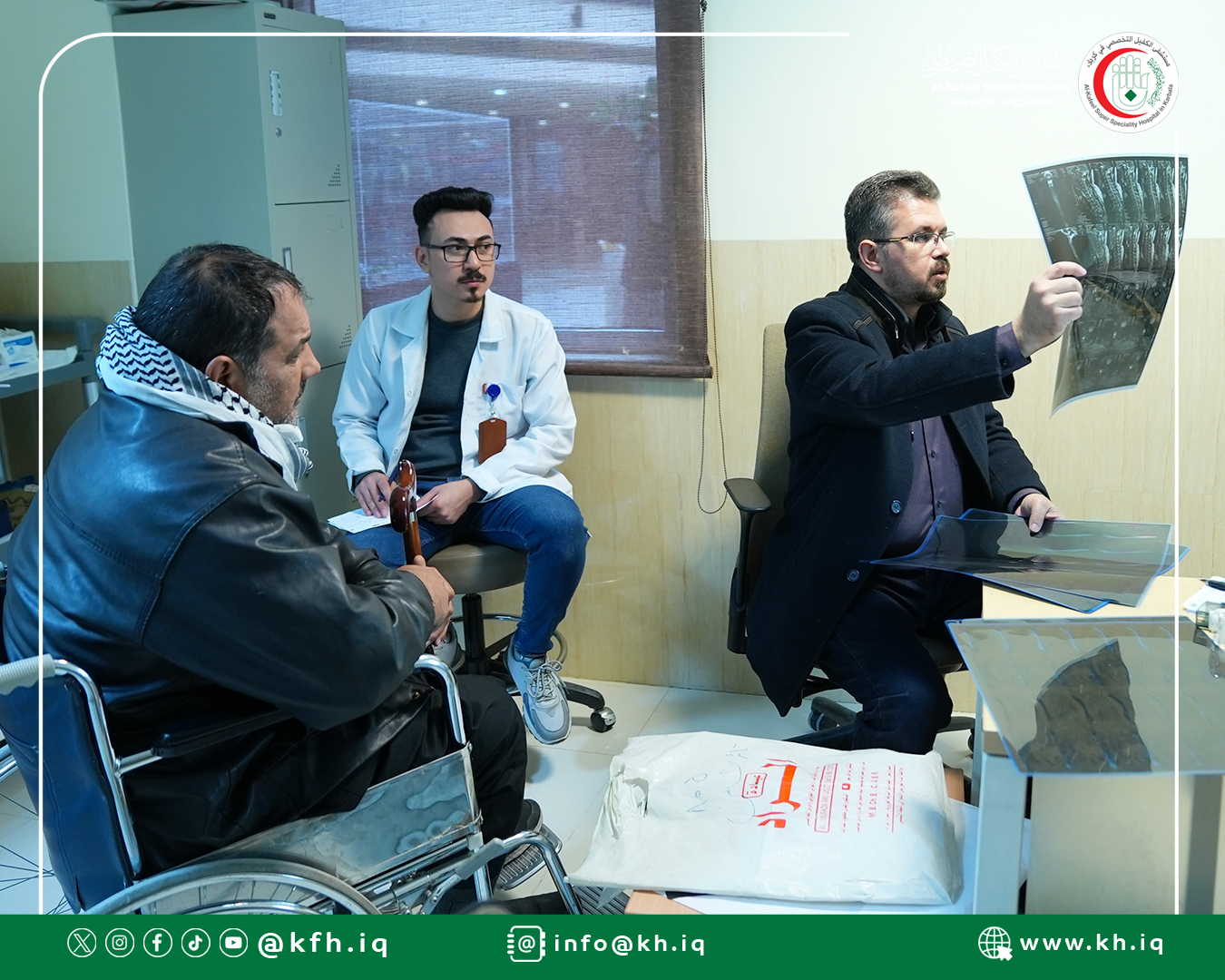 While receiving the wounded, the specialist in neurological surgery, Dr. Samer Faisal, explained that the hospital received today a number of the wounded of the Popular Mobilization Forces, who were sent by the Popular Mobilization Authority, in cooperation with the Iraqi Ministry of Oil, to examine them, provide them with the necessary treatment, and perform the necessary surgical operations for those whose condition requires that.