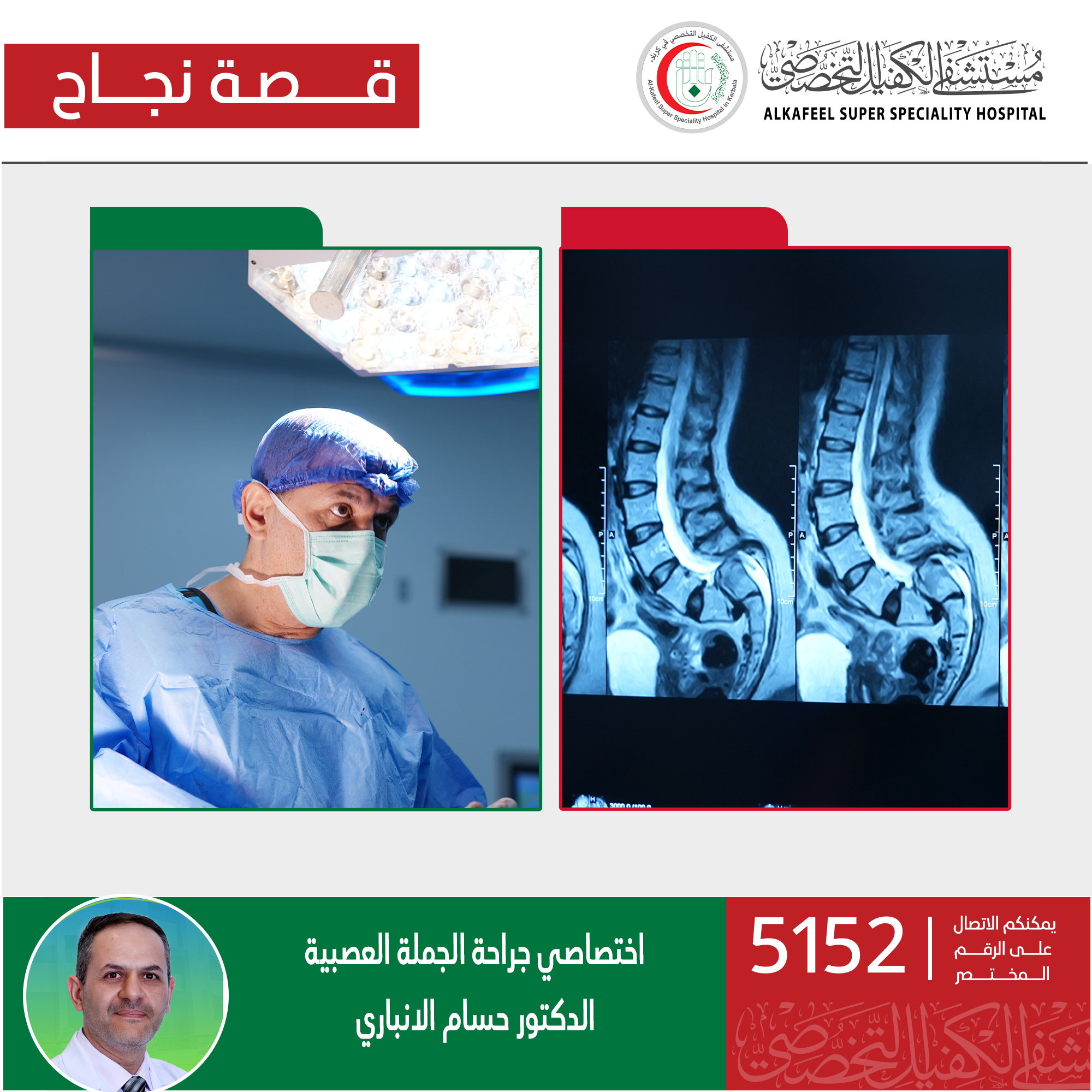 تقنيات ومواد طبية اُخرى، مؤكدا نجاح فريقه الطبي بإرجاع الفقرات الى وضعها الأول