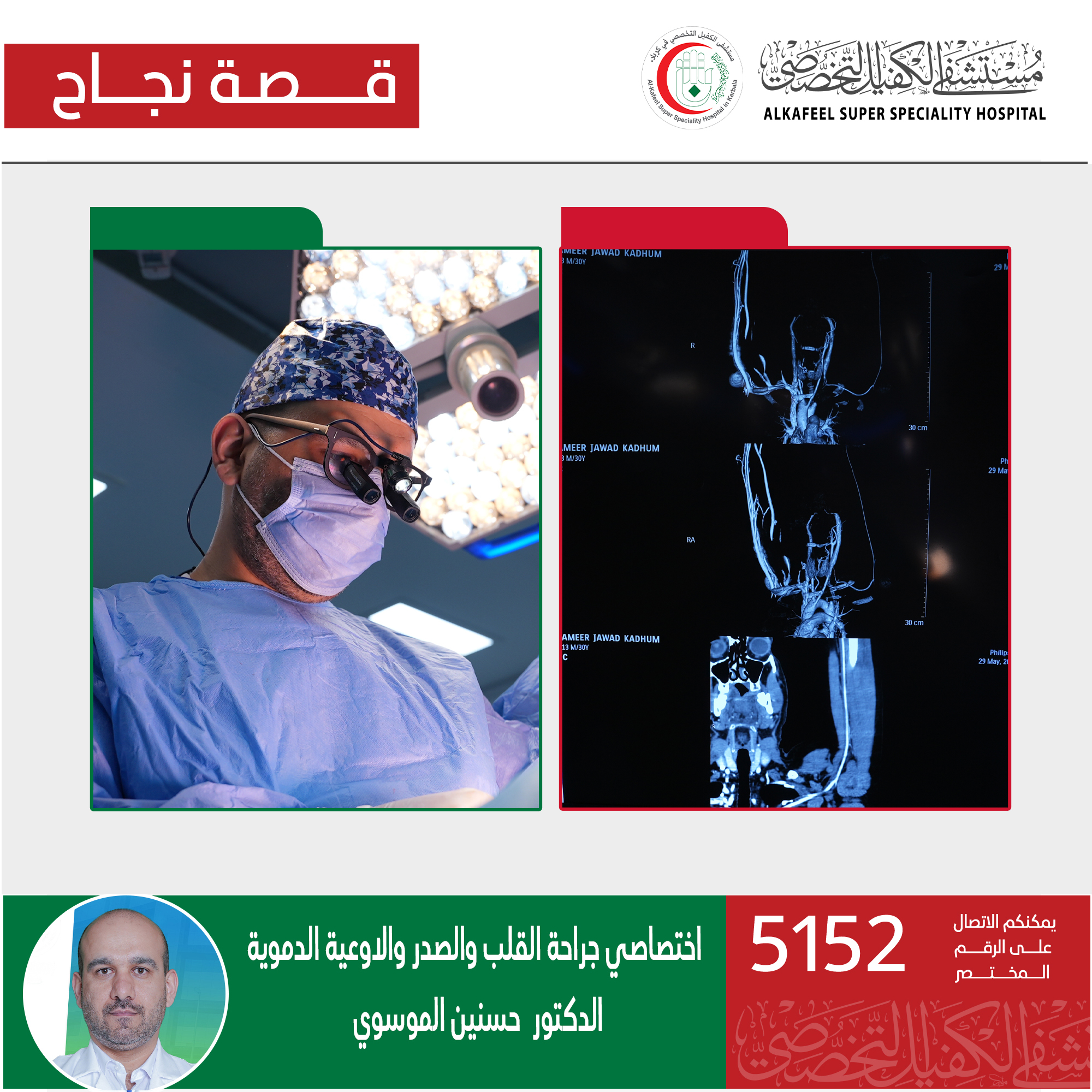 وأضاف الطبيب الجراح، تم إجراء عملية له لإعادة التروية عن طريق زرع شريان بين الشريان السباتي الايسر الى الشريان تحت الترقوة الايسر، مؤكدا نجاح العملية والمريض الآن بصحة جيدة والطرف تمت ترويته بنجاح والنبض عاد الى الطرف بصورة جيدة وممتازة.