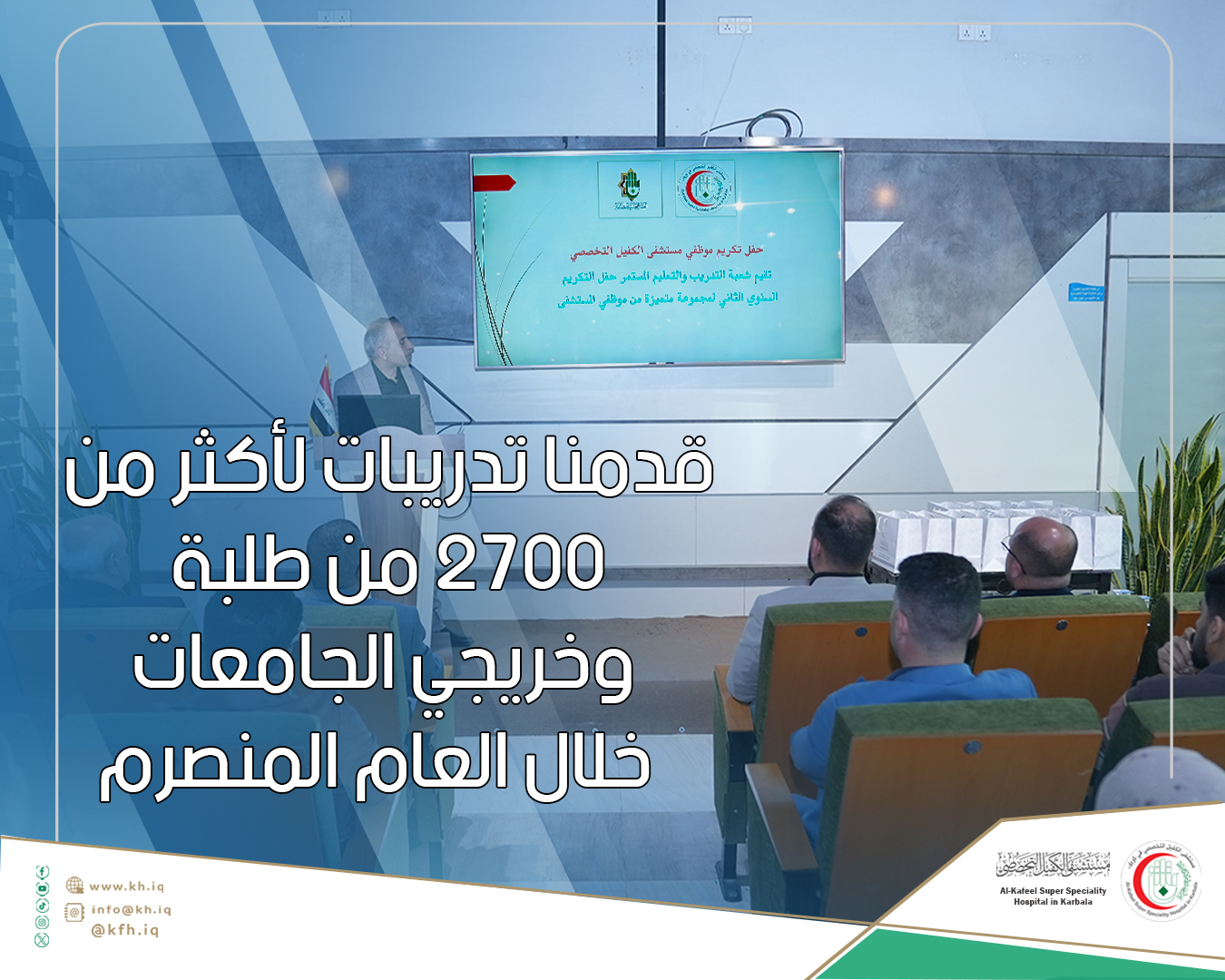 أعلن مستشفى الكفيل التخصصي، عن تقديم خدمات التدريب والتعليم لأكثر من (2700) مستفيداً بتخصصات طبية وتمريضية وتقنية مختلفة، فيما كشف عن مساهمته في إنجاز (20) بحثاً في الدراسات العليا لجامعات عراقية معها جامعة تونسية واخرى إيرانية.
