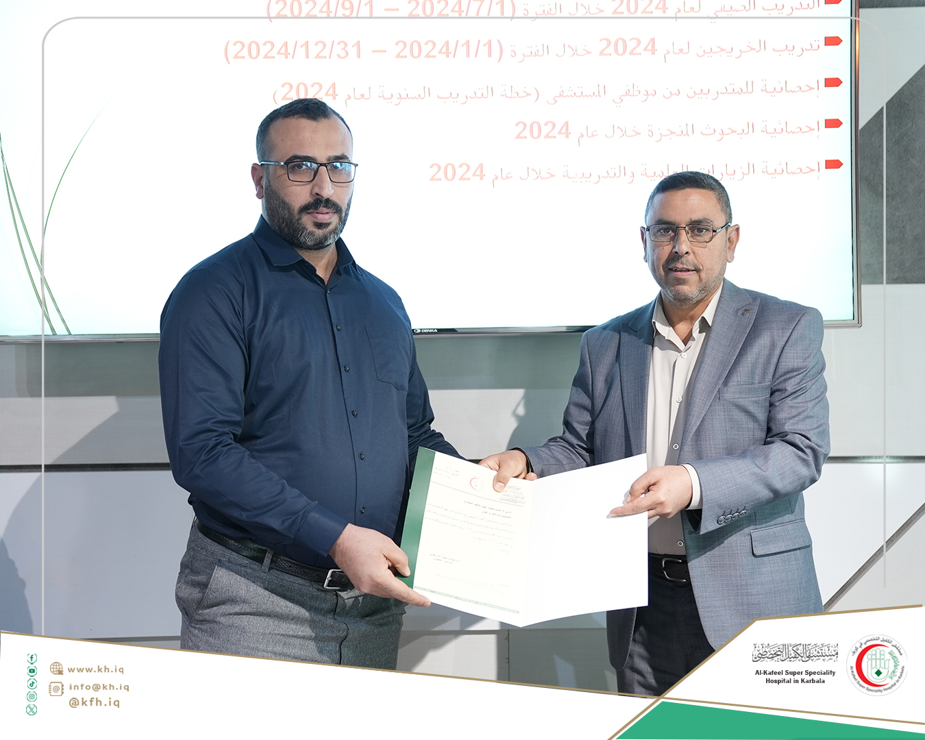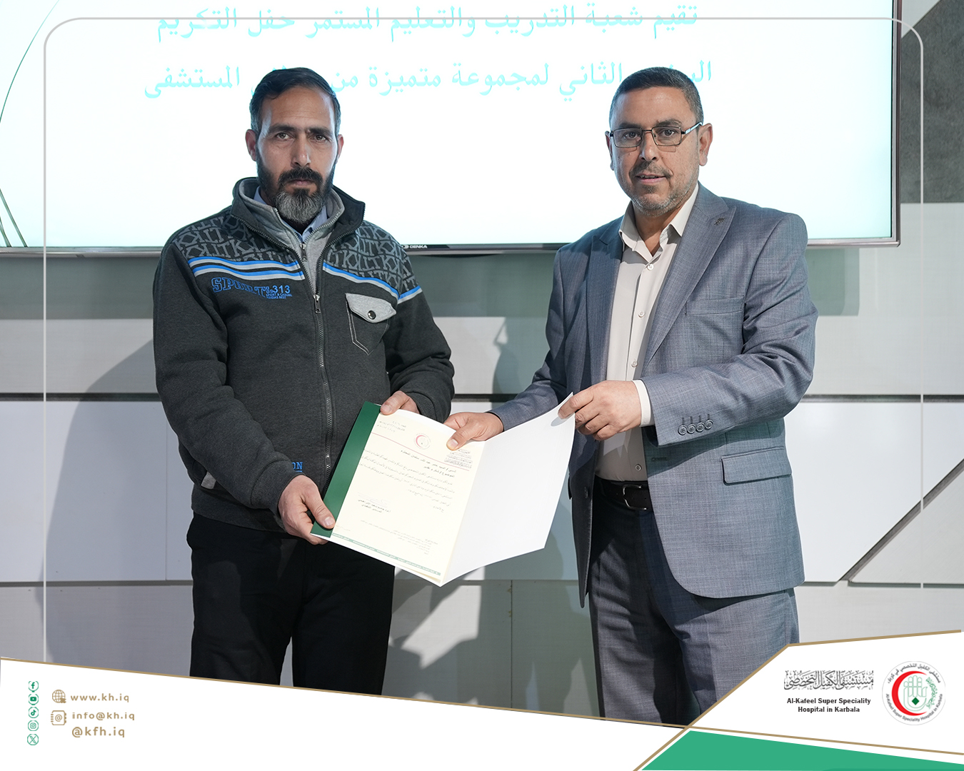 جاء ذلك على هامش الحفل الذي نظمته شعبة التدريب والتعليم المستمر في المستشفى، لتكريم الموظفين الذين حصلوا على تقييمات عالية في التدريبات والورش التي اقيمت خلال عام 2024 المنصرم، وتكريم الموظفين الذين حصلوا على الشهادات الأكاديمية العليا إضافة إلى تكريم المدربين، على قاعة المؤتمرات في المستشفى.
