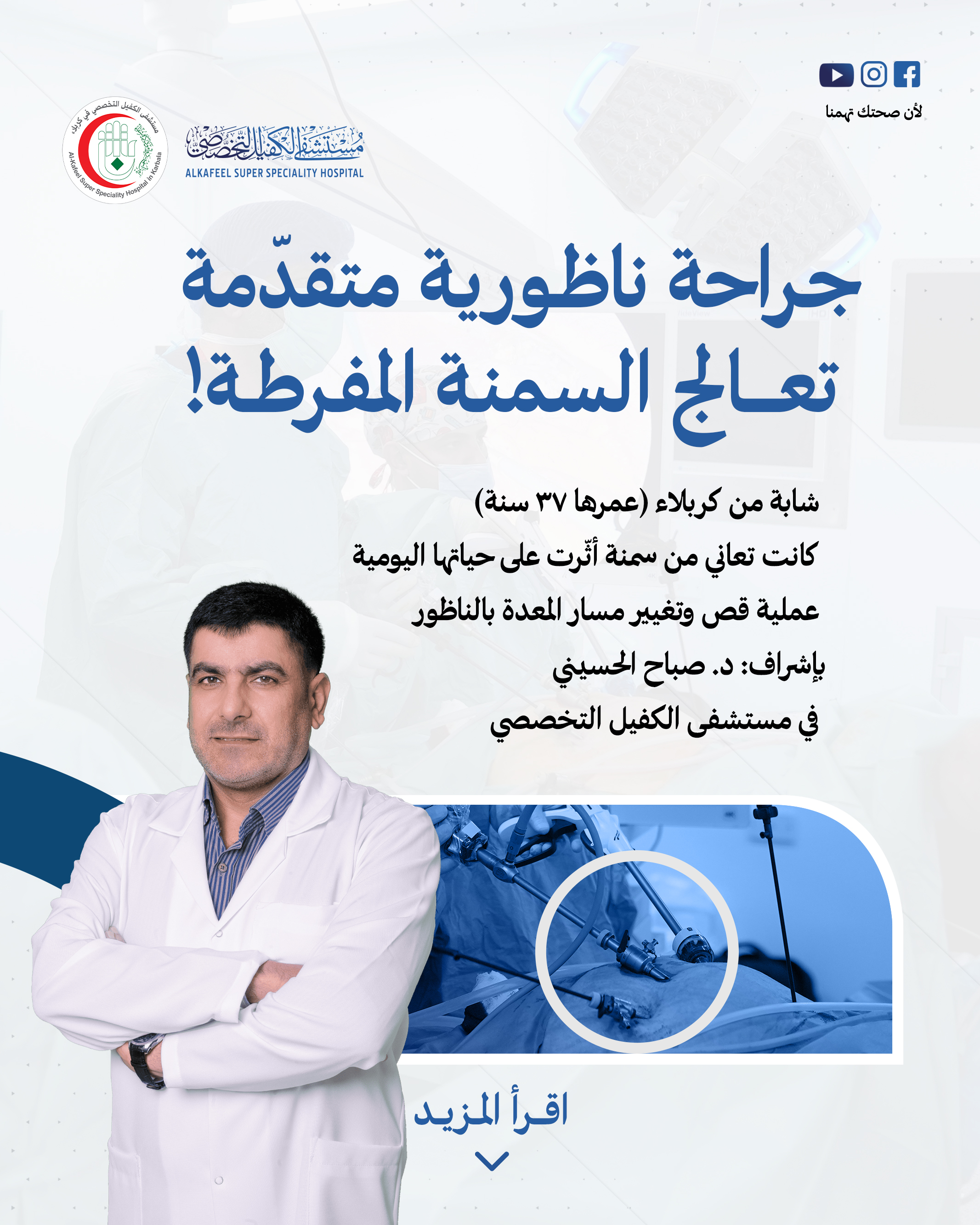 كشف فريق طبي متخصص بالجراحة العامة في مستشفى الكفيل التخصصي بكربلاء عن نجاحه بعملية معقدة لمريضة تبلغ من العمر 37 عامًا من محافظة كربلاء، كانت تعاني من السمنة المفرطة.