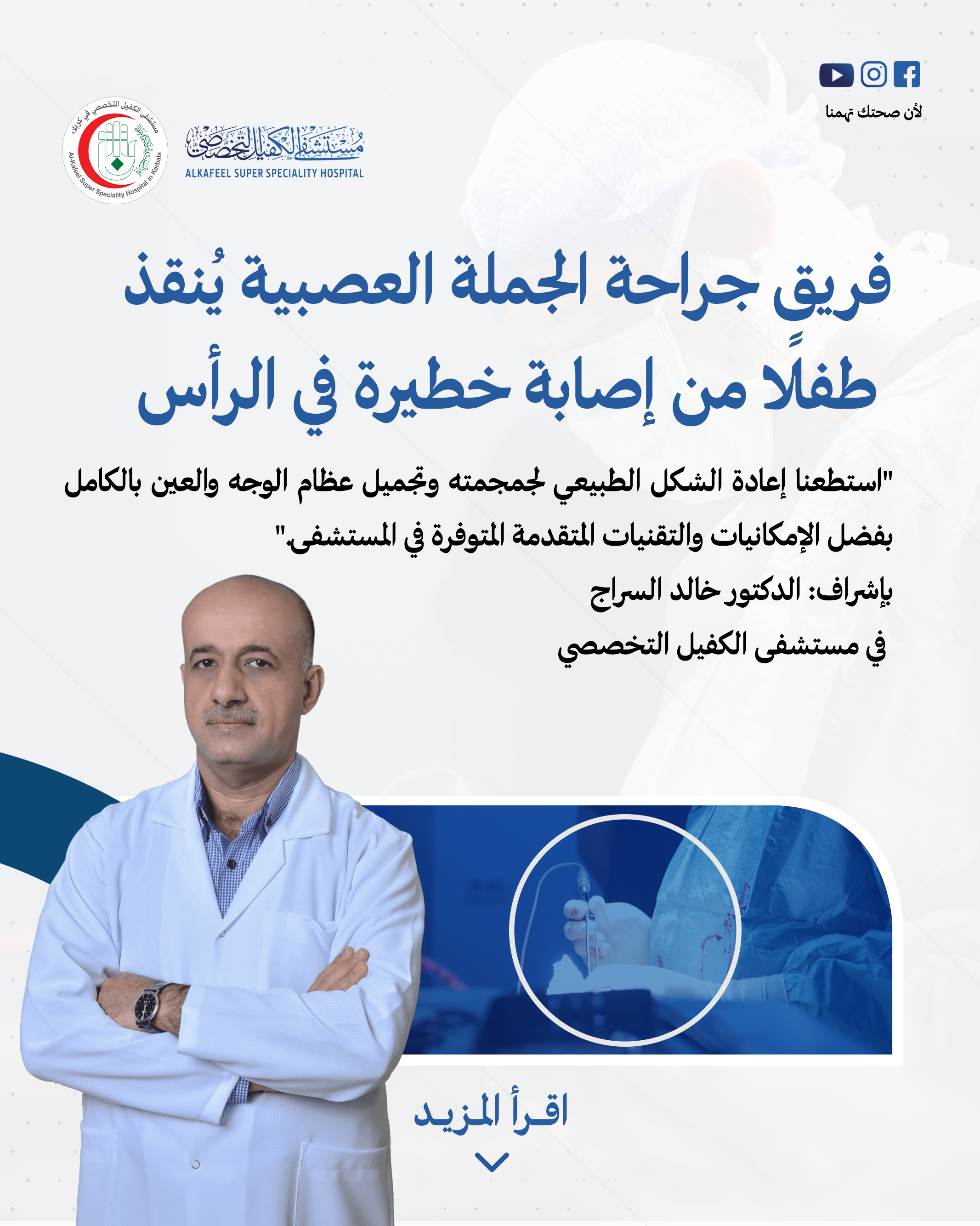 حقق فريق طبي متخصص بجراحة الجملة العصبية في مستشفى الكفيل نجاحًا بإجراء عملية جراحية معقدة لطفل يبلغ من العمر 14 عامًا، تعرض لحادث تسبب له بتهشم الجمجمة وتهشم سقف محجر العين.