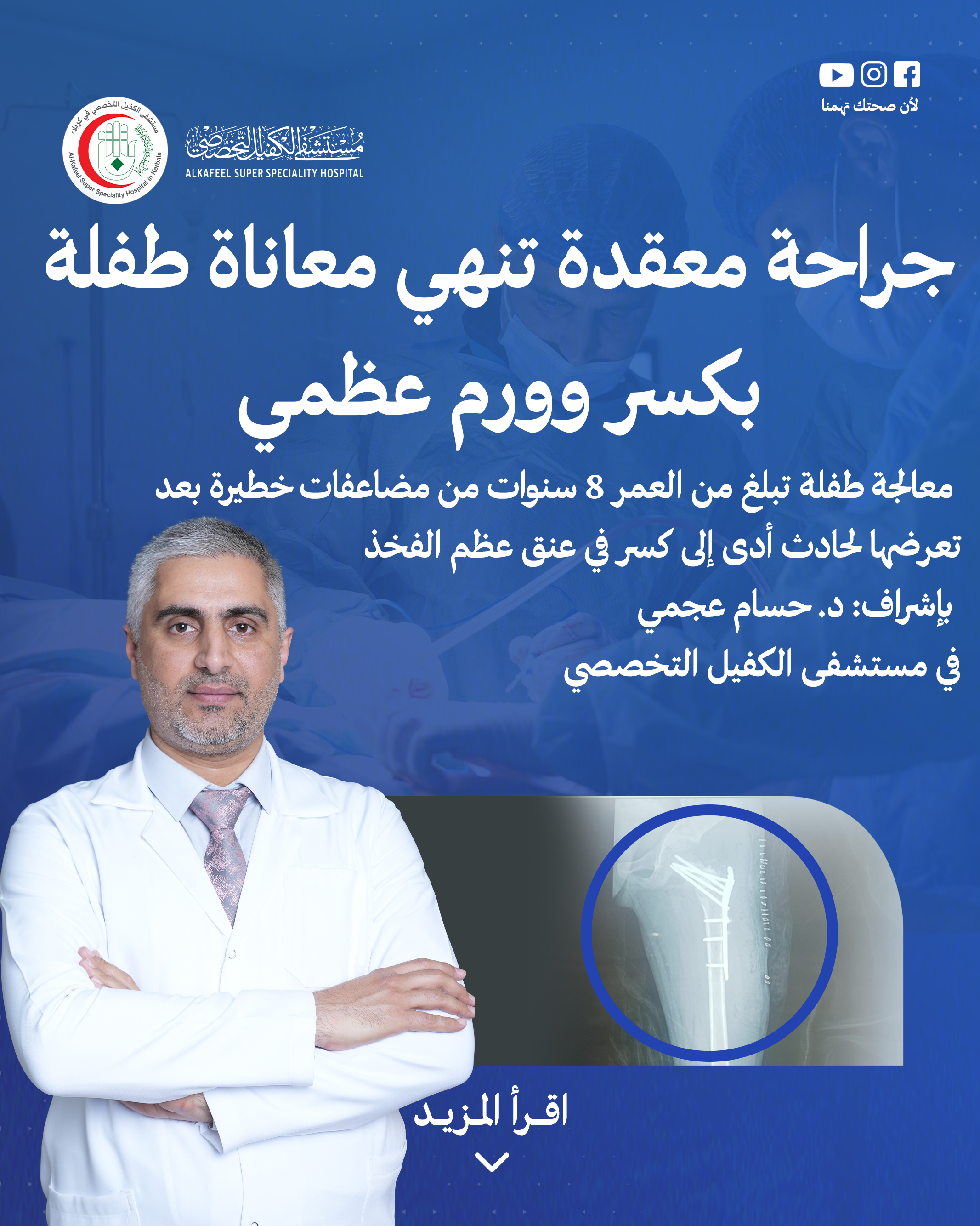 وأوضح عجمي، انه في خطوة جراحية دقيقة، تم رفع الورم بشكل كامل لتعزيز فرص الشفاء، وتم استبدال العظم المتضرر بعظم صناعي متطور، بالإضافة إلى تثبيت الكسر بواسطة صفيحة مغلقة لضمان استقرار العظم وسرعة التعافي.