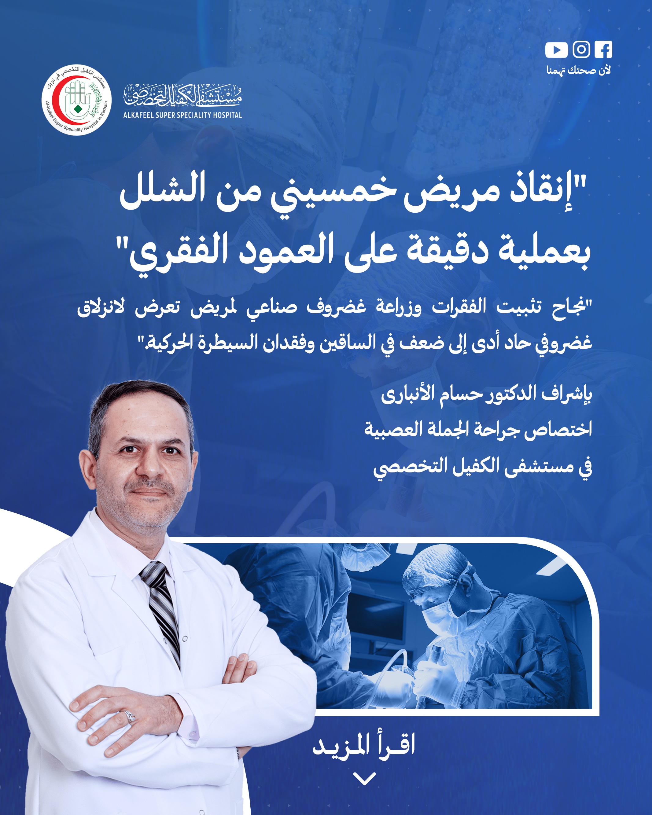 وأضاف الانباري، بالإضافة إلى ذلك، كان المريض يعاني من انزلاق غضروفي شديد في الفقرة القطنية، مما أدى إلى عدم استقرار الفقرة مما يسمى "تزحلق فقري"، مشيرا الى انه أجرينا له عملية طارئة في مستشفى الكفيل، تم خلالها تثبيت الفقرات باستخدام البراغي ورفع الانزلاق الغضروفي وزراعة غضروف صناعي.