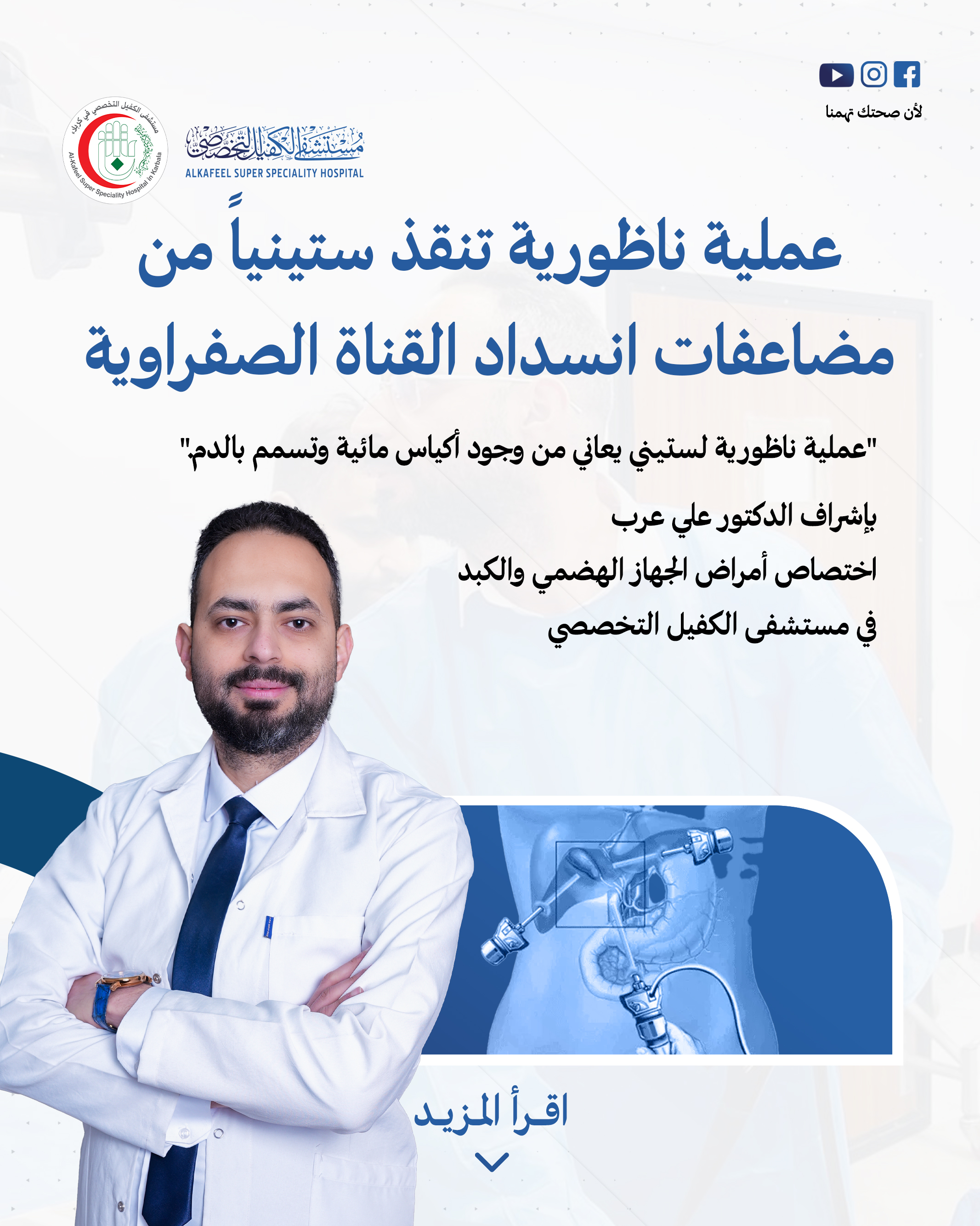 وبين عرب، أجرينا للمريض عملية ناظور قسطرة القنوات الصفراوية (ERCP) بنجاح، حيث تم خلال العملية فتح الانسداد ووضع دعامة بلاستيكية لتصريف الصفراء.