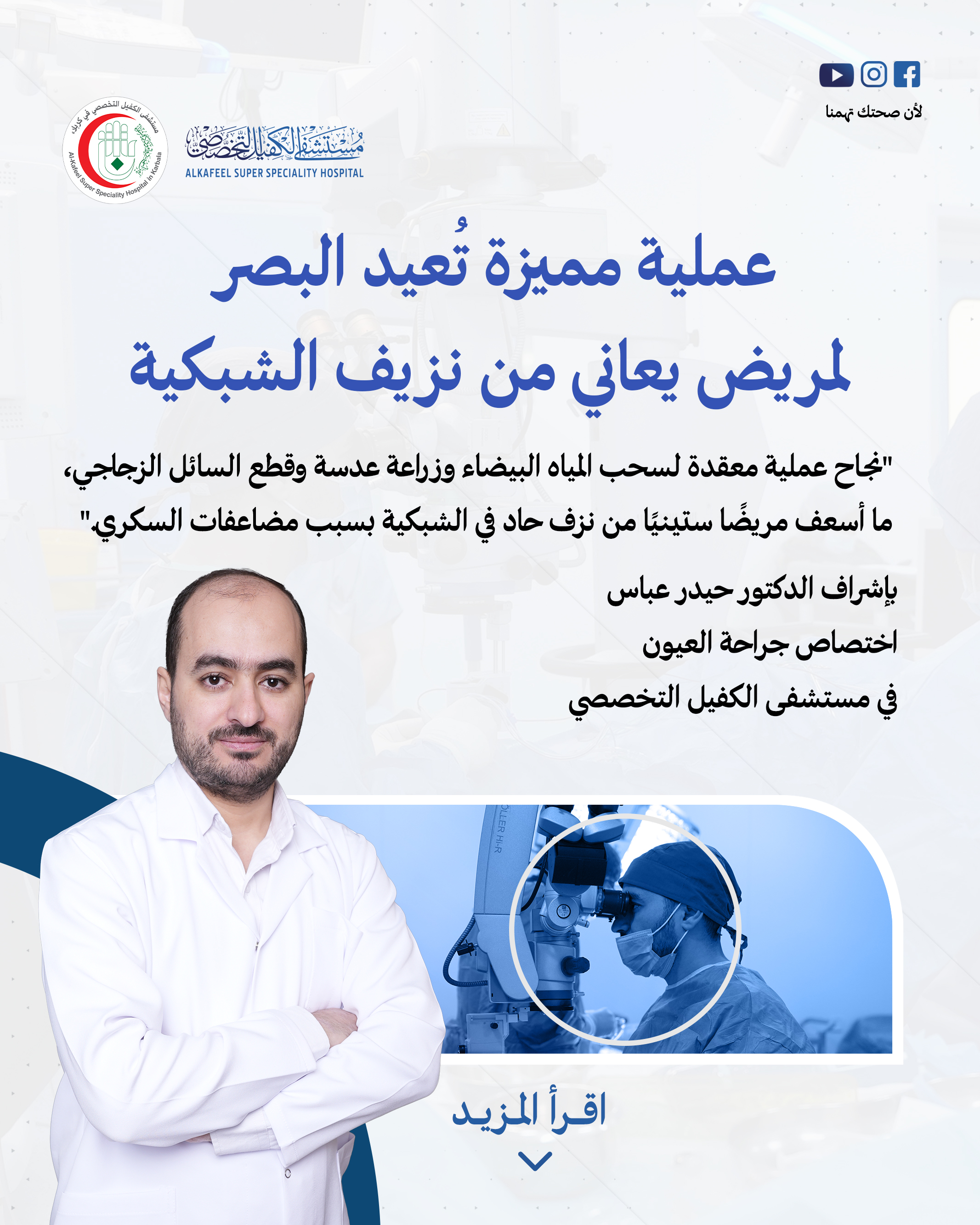 وأشار عباس إلى إن الحالة كانت تتطلب تدخلاً جراحياً متخصصاً، حيث قمنا في مستشفى الكفيل بإجراء عملية معقدة تشمل سحب المياه البيضاء، وزراعة عدسة، وقطع السائل الزجاجي لإزالة النزيف والتليفات التي كانت تؤثر بشكل كبير على وظيفة الشبكية.