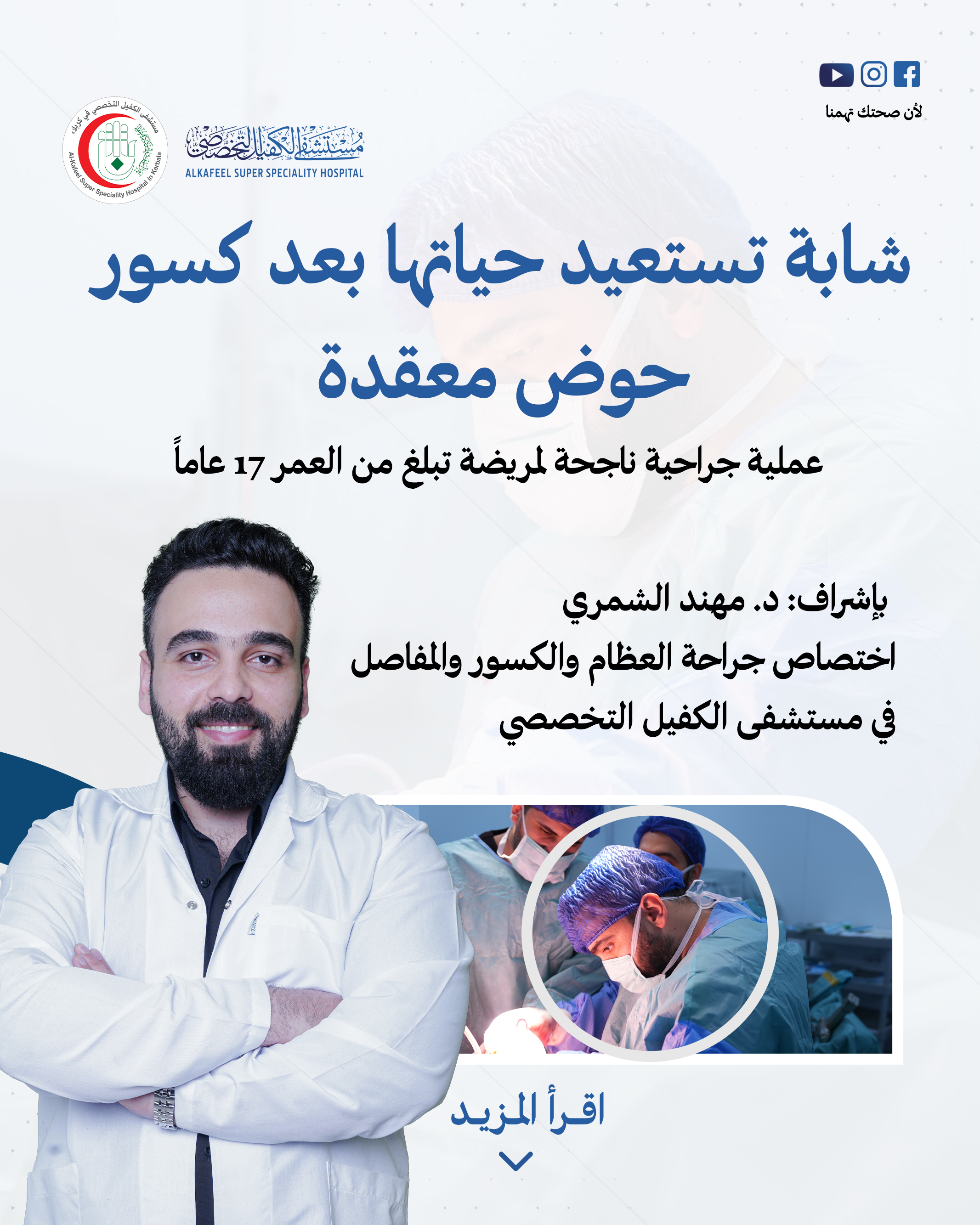 نجح فريق طبي متخصص بجراحة العظام والكسور والمفاصل في مستشفى الكفيل التخصصي بكربلاء في إجراء عملية جراحية ناجحة لمريضة تبلغ من العمر 17 عاماً، كانت تعاني من كسور متعددة ومعقدة ومضاعفة في قرص عظم الحوض.
