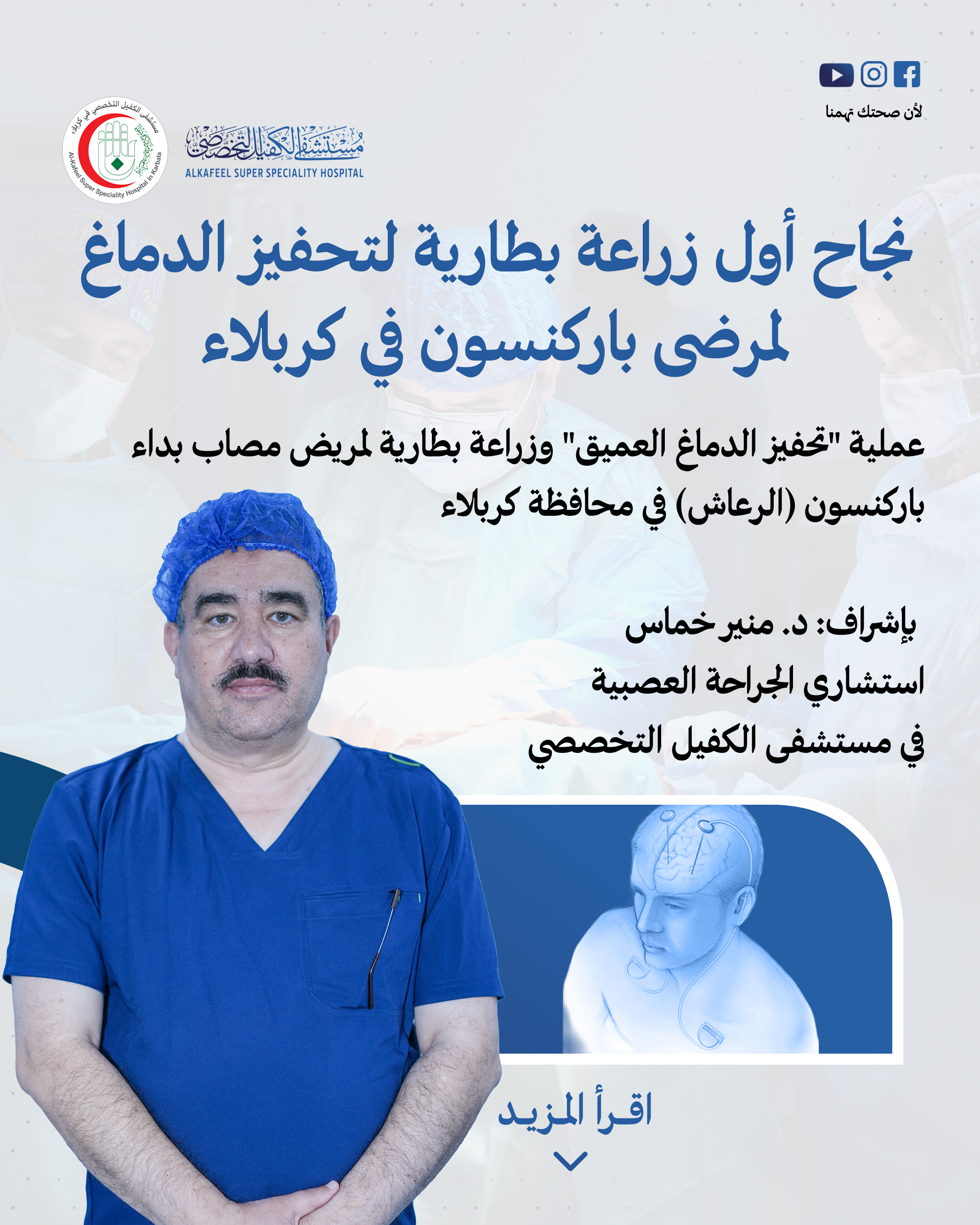 أعلن استشاري الجراحة العصبية، الدكتور منير خماس، عن إنجاز طبي رائد في مستشفى الكفيل التخصصي، تمثل في إجراء أول عملية "تحفيز الدماغ العميق" وزراعة بطارية لمريض مصاب بداء باركنسون (الرعاش) في محافظة كربلاء.