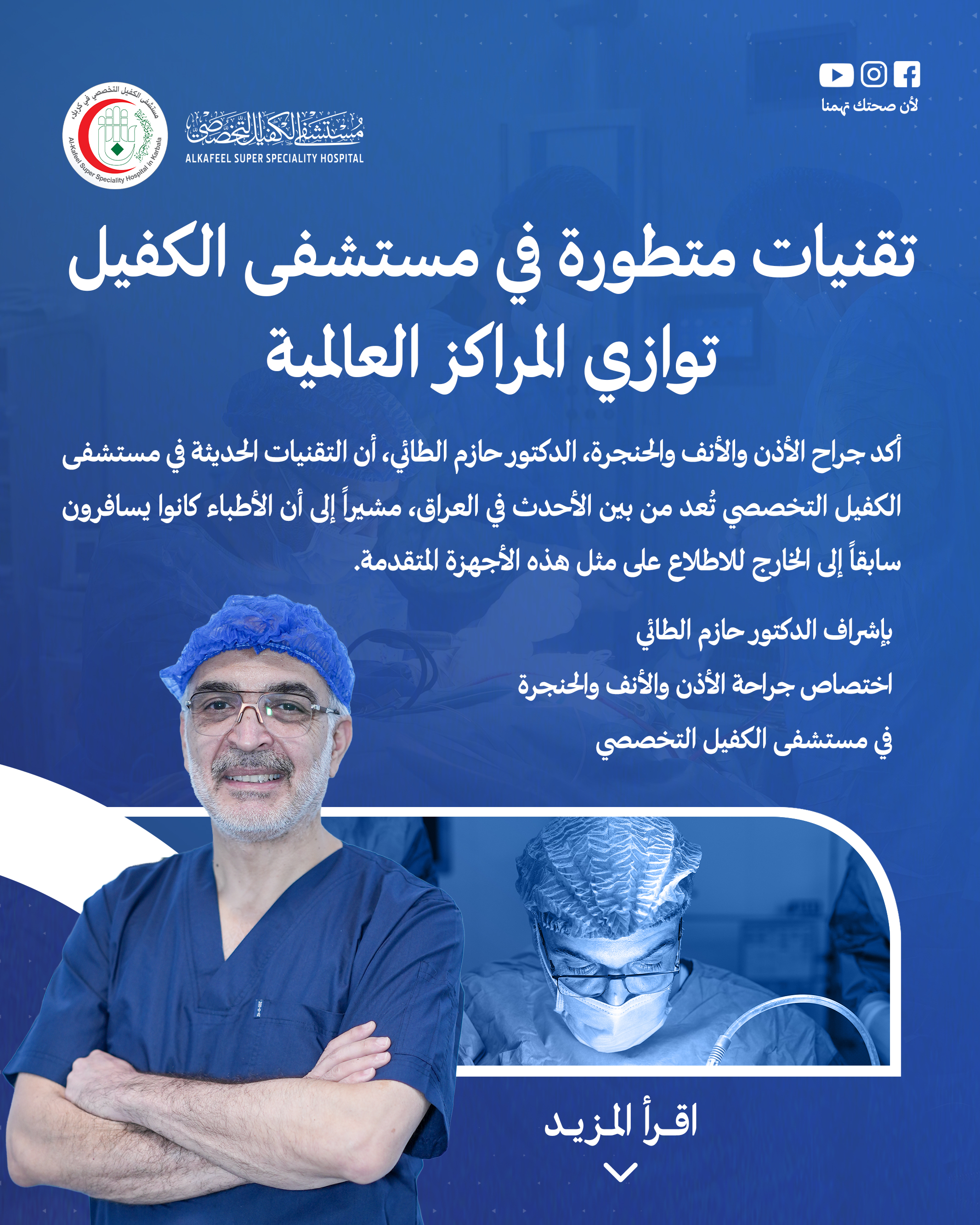 وقال اختصاصي جراحة الاذن والانف والحنجرة، د. حازم الطائي، ان "مستوى تطور وحداثة التقنيات والأجهزة الطبية المتوفرة في مستشفى الكفيل هو مدعاة للسرور، لا سيما تقنية المايكروسكوب الجراحي وتقنيات التخدير وأدويته إلى جانب التقنيات الأخرى التي تستخدم في العمليات المتقدمة"، مفصحاً "ان مثل هذه التقنيات الطبية الحديثة كنّا نسعى إليها، وكثيراً ما ذهبنا إلى الدول الأخرى للإطلاع عليها".