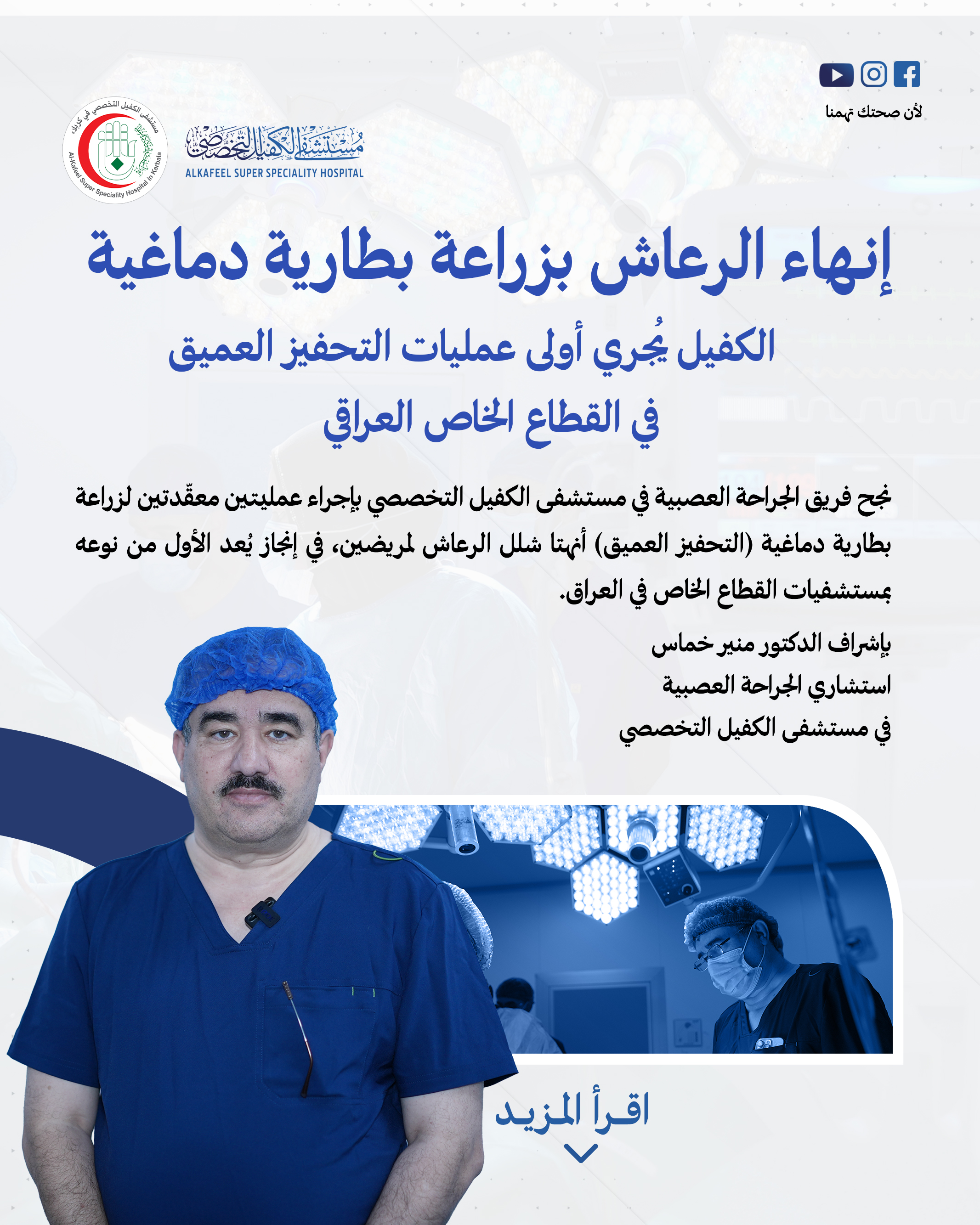 وقال رئيس الفريق، الاستشاري بالجراحة العصبية، الدكتور منير خماس، إن فريقنا الطبي تمكن من إجراء عمليتين لـ "تحفيز الدماغ العميق" لمريضين مصابين بداء الرعاش (باركنسون)، في مستشفى الكفيل التخصصي، وهما أول عمليتين تُجرى بمستشفيات القطاع الخاص على مستوى العراق، نظراً لصعوبة توفير متطلباتها والبنى التحتية اللازمة لنجاحها، واصفاً عملية "تحفيز الدماغ العميق" بأنها من أعقد عمليات الجراحة العصبية عالمياً، وفي الأعوام الأخيرة كان المرضى يرسلون لخارج العراق لإجرائها.
