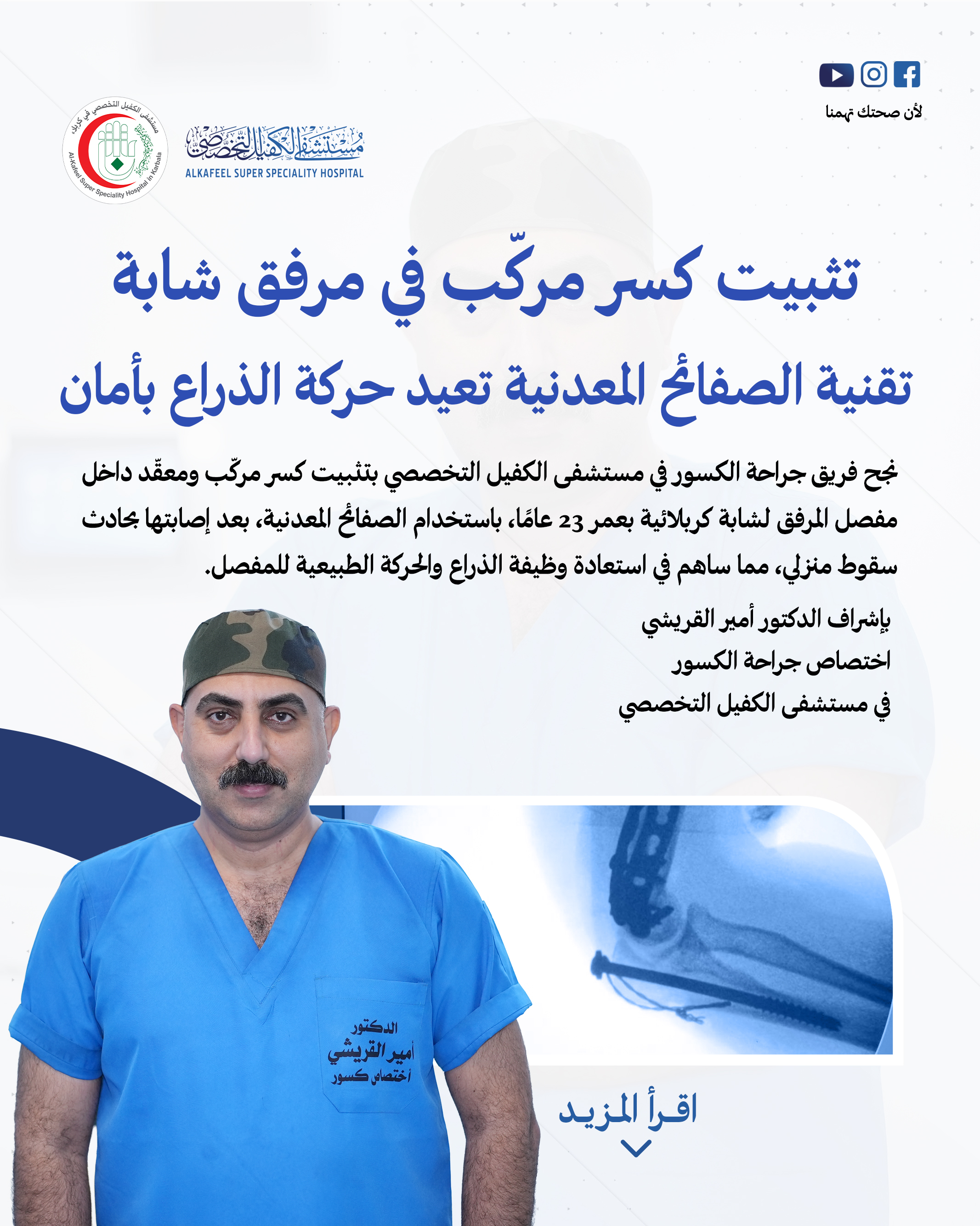 وأكد القريشي إن هذا النوع من الكسور يُعتبر خطيراً لارتباطه بحركة المرفق، وبعد تقييم الحالة، تم تحضير الفريق الجراحي ووضع خطة علاجية دقيقة، لافتا الى انه تمت الجراحة في صالات العمليات بمستشفى الكفيل، حيث تم فتح عظم المفصل بعد إزالة جزء من عظم الساعد للدخول إلى المفصل بشكل آمن، وقد كان الكسر مهشماً، مما تطلب إجراء تثبيت دقيق باستخدام الصفائح المعدنية لضمان الالتئام السليم.