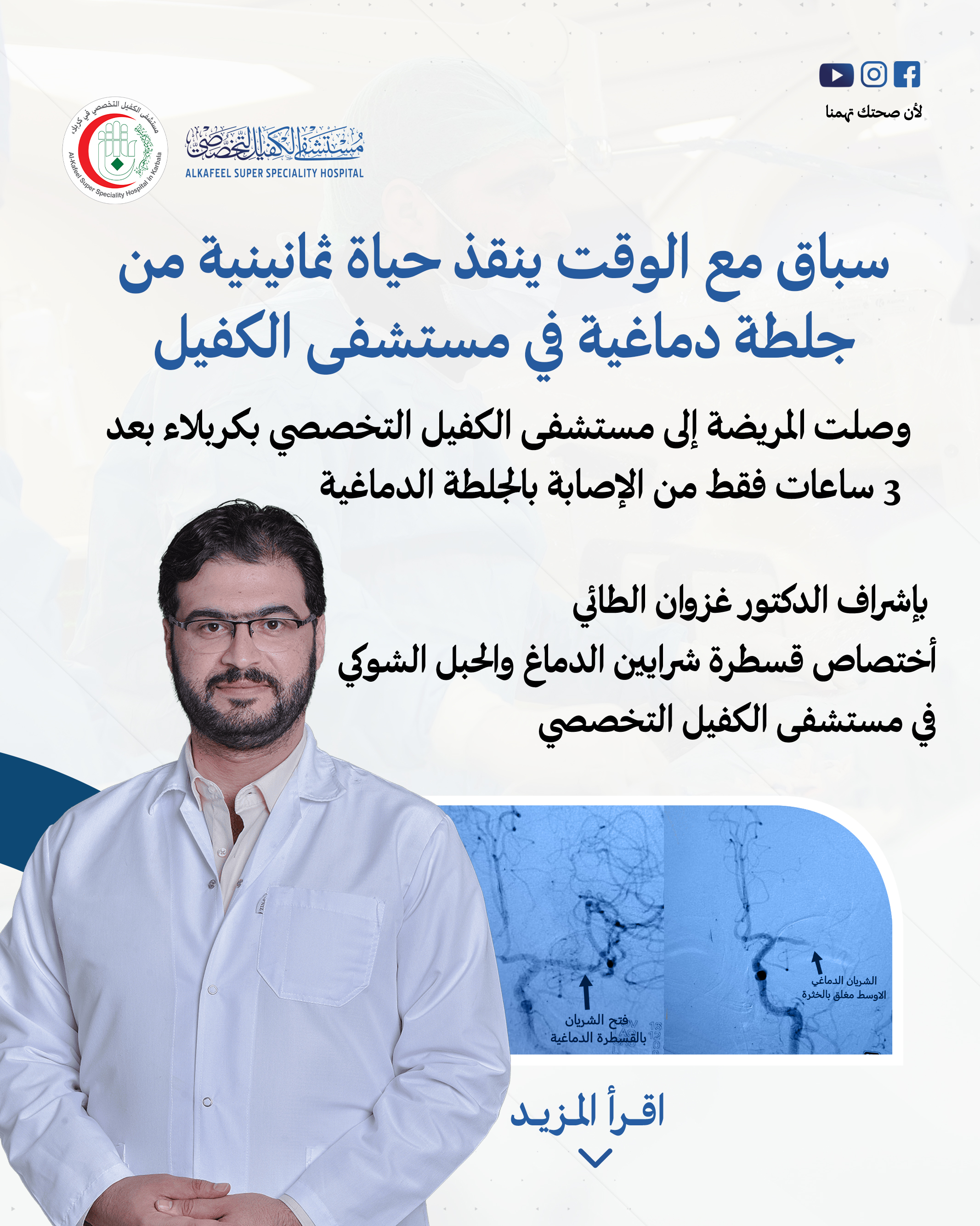 إلى مستشفى الكفيل التخصصي بكربلاء بعد 3 ساعات فقط من الإصابة بالجلطة الدماغية، كنا